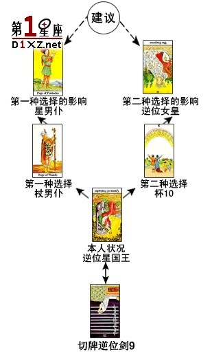 代表第一种选择所产生影响的牌是星男仆,表示问卜者能继续拥有一段安逸的生活,能进一步提高自己的知识水平,但与女友的关系走向可能出现阴影。