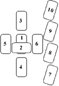1、依一般方式洗牌、切牌。将由上面数来的第七张牌放在如图示(1)的位置。